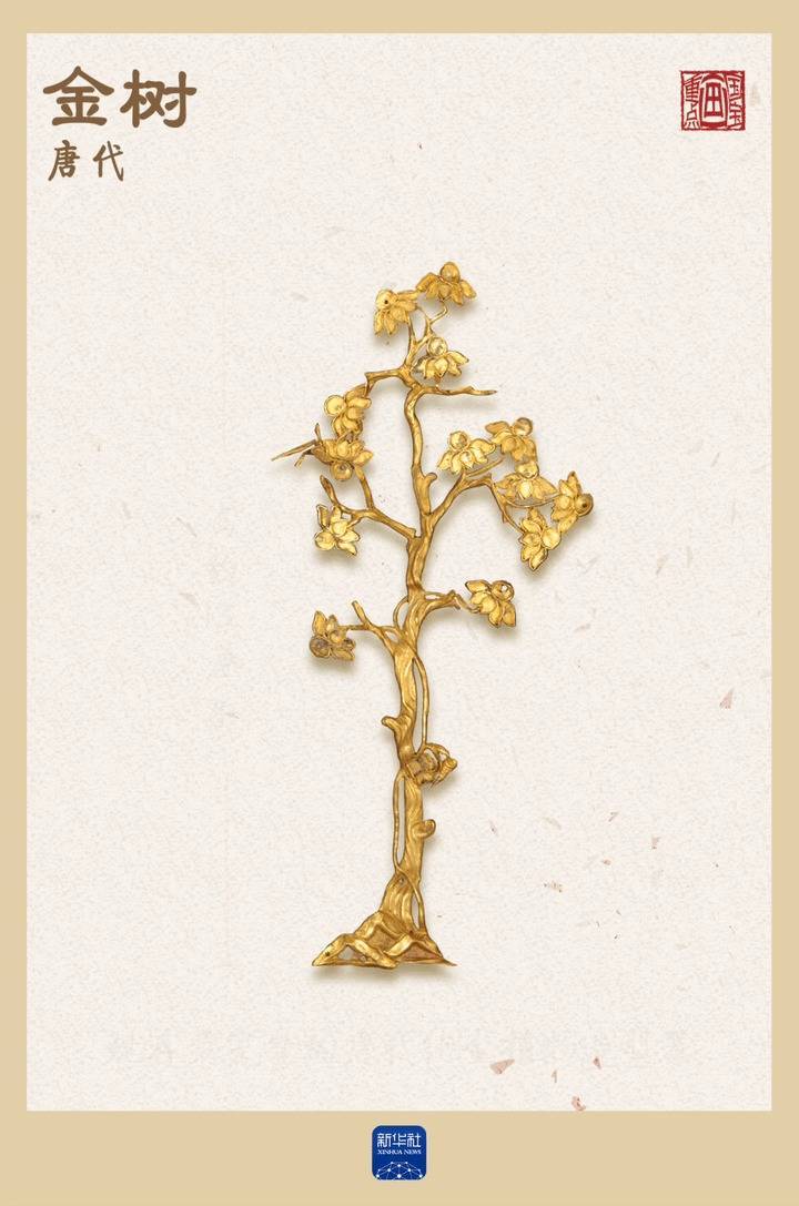这件西安博物院藏的金树,高约13厘米,由主干、花朵和枝叶组成。主干上有树节,根部有长藤向树上盘绕,树干下部露出树根。树上的花朵原嵌有绿松石,金树绿花,劲枝柔藤,分外富丽。