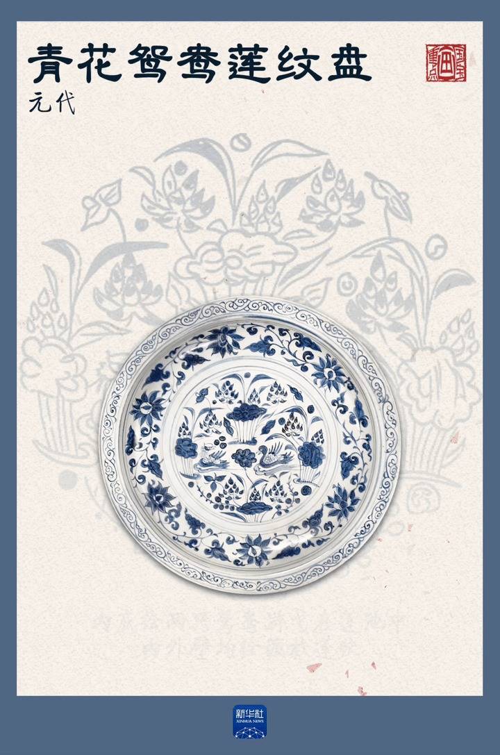 这件元代青花鸳鸯莲纹盘,现藏于南京博物院,主题纹饰为莲池鸳鸯图,这种莲池小景是元代青花瓷器上常见的装饰题材,多画在大盘、大碗的内底,有的只绘莲池,有的在莲池中绘有禽鸟(鸳鸯、鹭鸶等)。