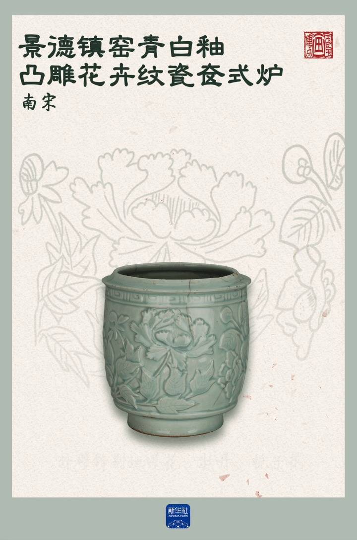 这件景德镇窑青白釉凸雕花卉纹瓷奁式炉藏于遂宁市博物馆,整体采用了剔花装饰,这种技法始见于北宋,有“留花剔地”和“留地剔花”两种。此器为“留花剔地”,先在坯体上敷一层化妆土,然后划出纹饰,再剔去花纹外多余部分的化妆土,露出素胎,最后再罩上一层透明釉烧成,花纹凸起产生浅浮雕的效果。