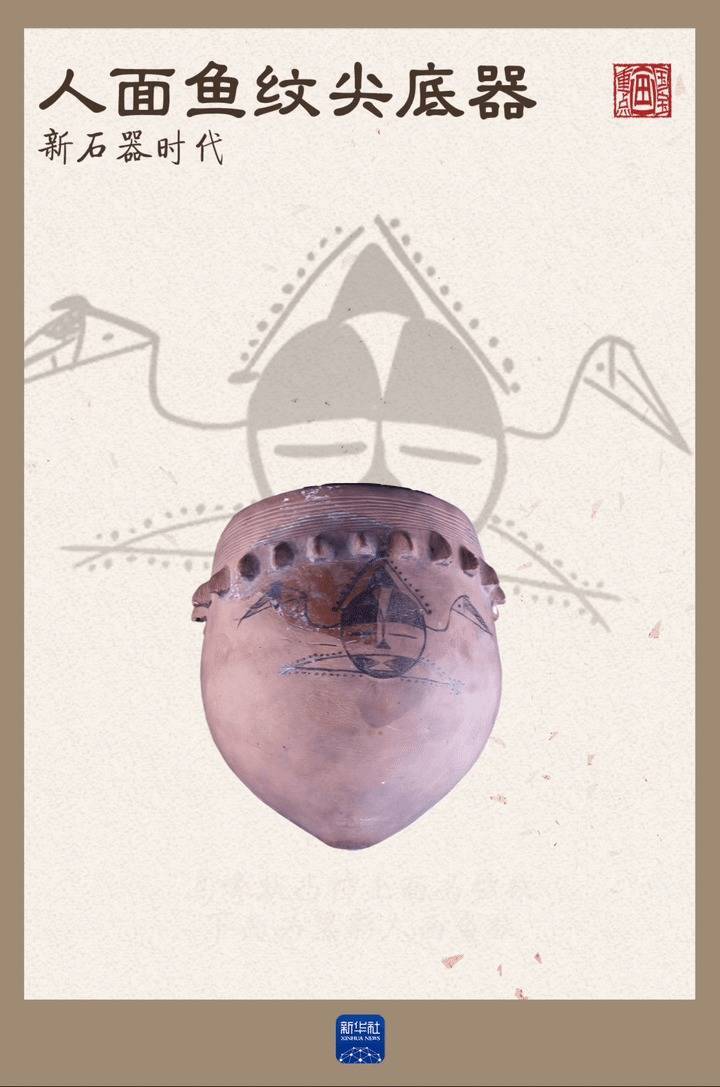 这件藏于西安半坡博物馆的人面鱼纹尖底器,人面呈圆形,有三角形发髻,用黑三角作眉,眼睛细而平直,似闭目状,耳侧向外平伸后向上弯曲,曲端连一条小鱼,神秘古朴。