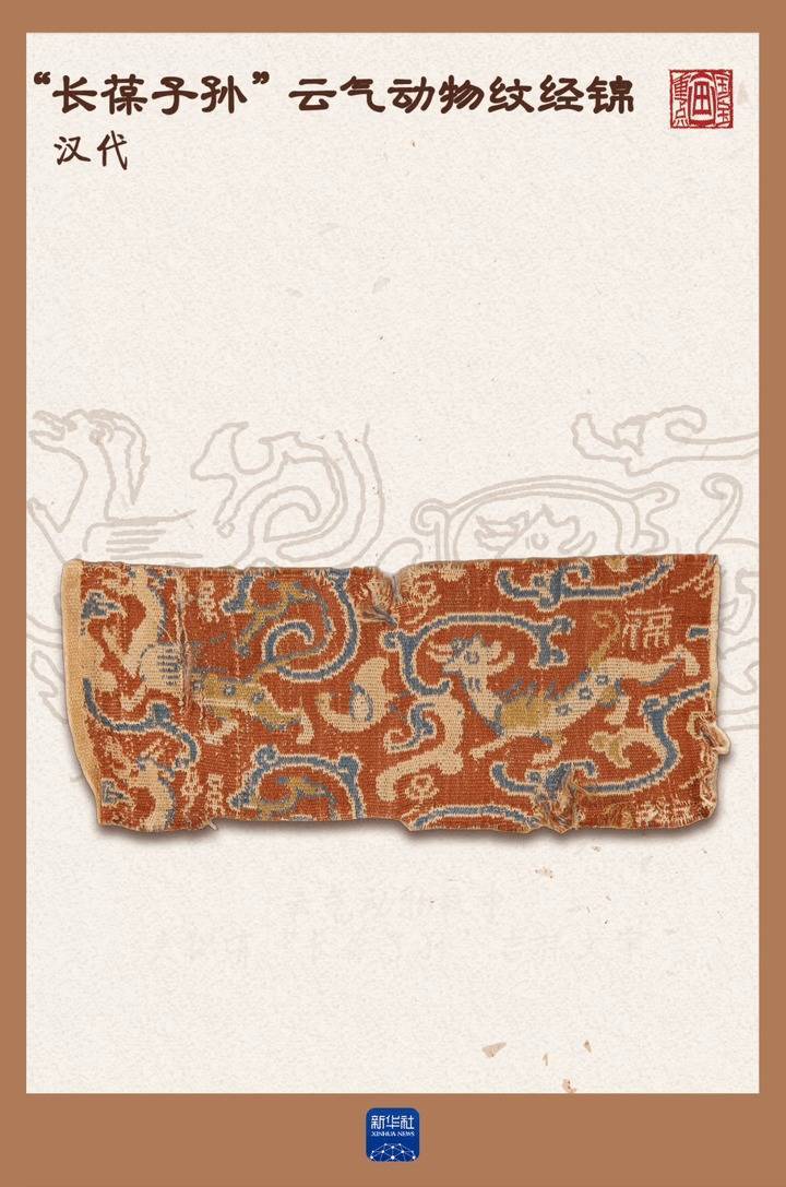 经锦,采用二重平纹组织,是汉代最高水平的丝织物。这件“长葆子孙”动物纹经锦,现藏于中国丝绸博物馆,色彩保存完好,纹样具有典型的汉代织锦特点,云气动物纹中夹织有“长葆子孙”隶书吉祥文字,体现了当时人们对荫及子孙的渴望。