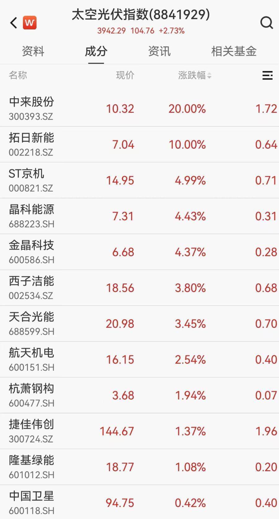 2月4日,A股太空光伏板块迎来强势爆发,截至午盘,太空光伏指数(8841929)大涨2.73%,其中,中来股份直线拉升,20CM涨停,拓日新能涨停,晶科能源、金晶科技、天合光能等跟涨。
