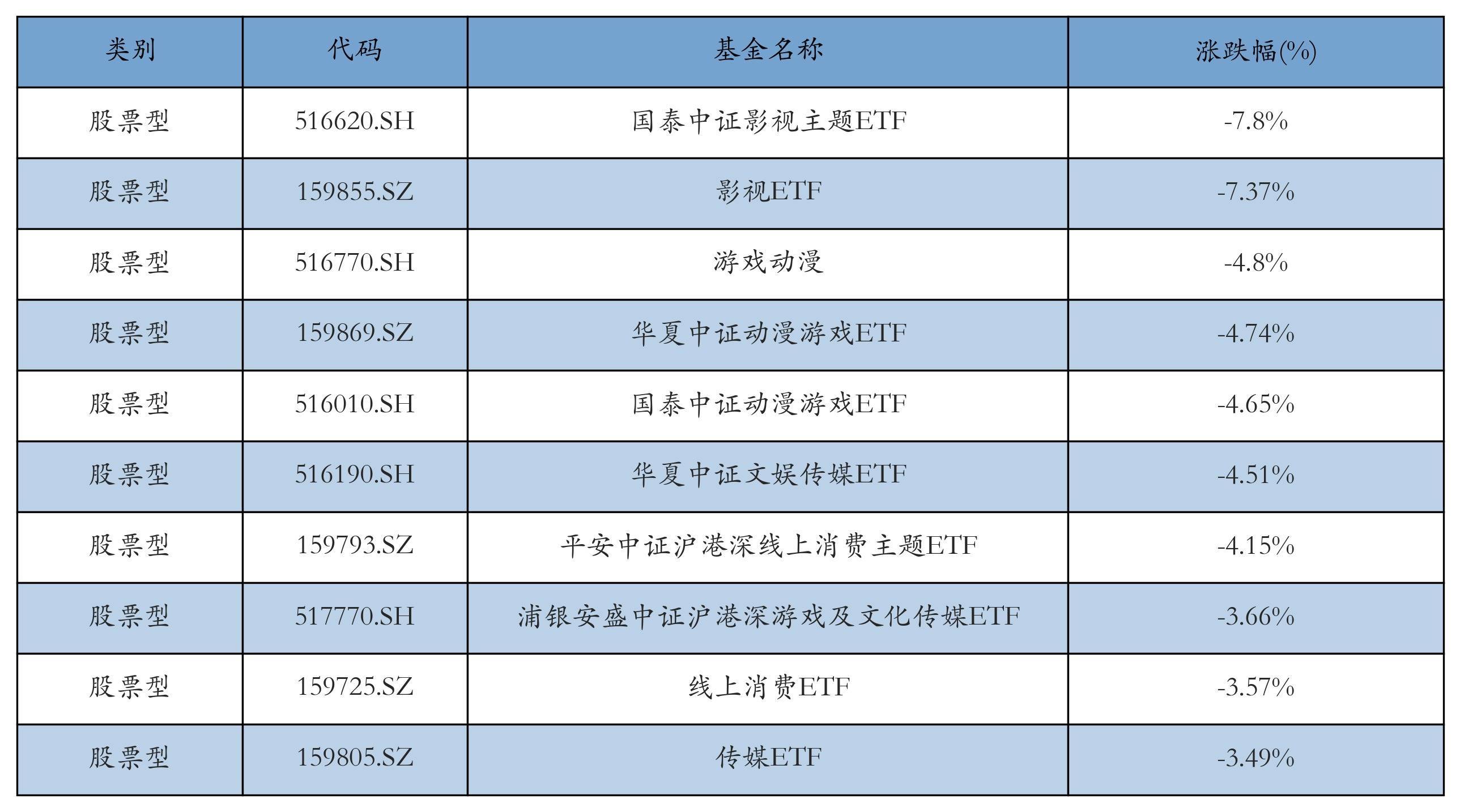 昨日股票型ETF跌幅最大的3只ETF及其收益率分别为:国泰中证影视主题ETF(-7.8%)、影视ETF(-7.37%)、游戏动漫(-4.8%)。跌幅前10详情见下表:
