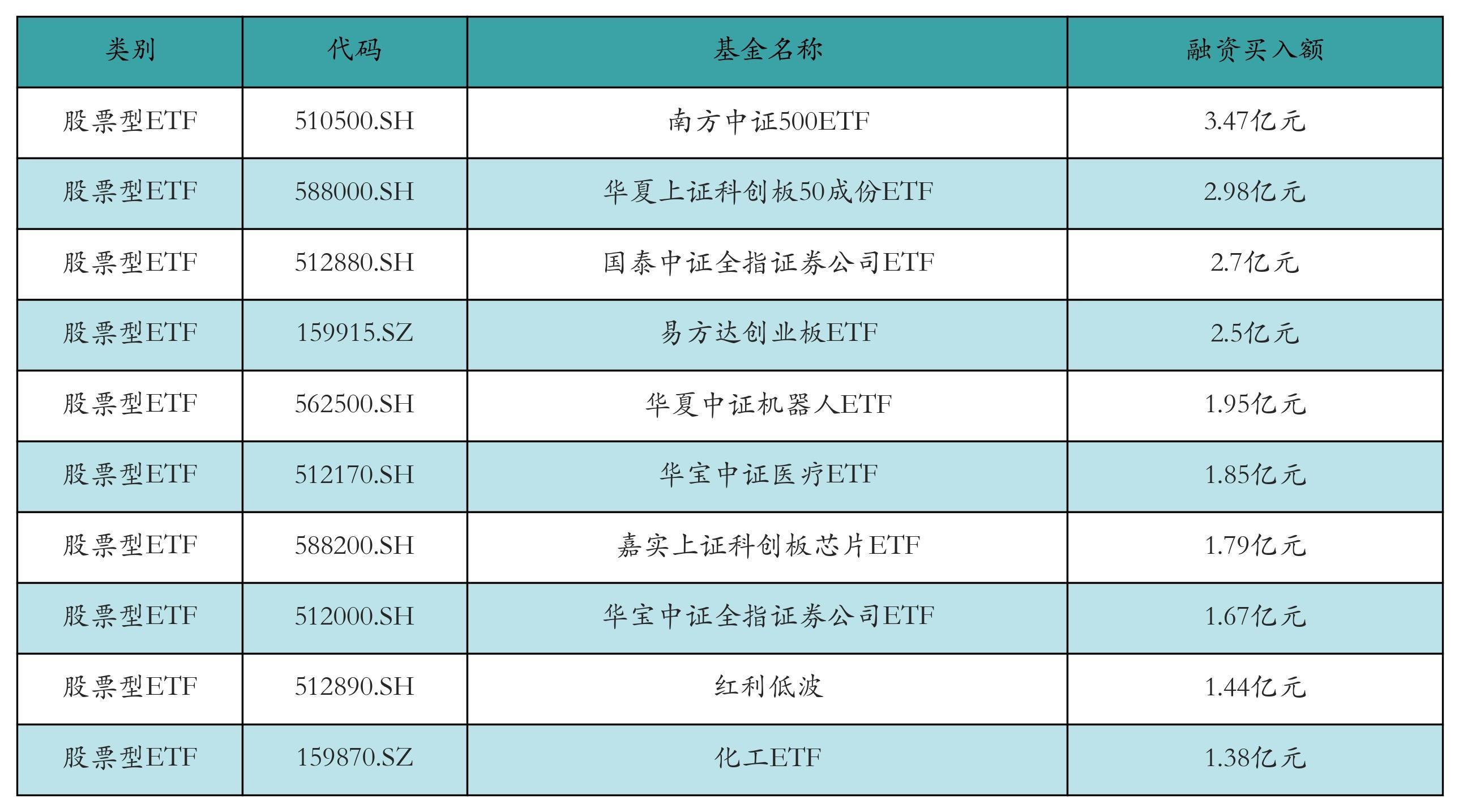昨日股票型ETF融资买入额最高的3只ETF及其买入金额分别为:南方中证500ETF(3.47亿元)、华夏上证科创板50成份ETF(2.98亿元)、国泰中证全指证券公司ETF(2.7亿元)。融资买入额前10详情见下表: