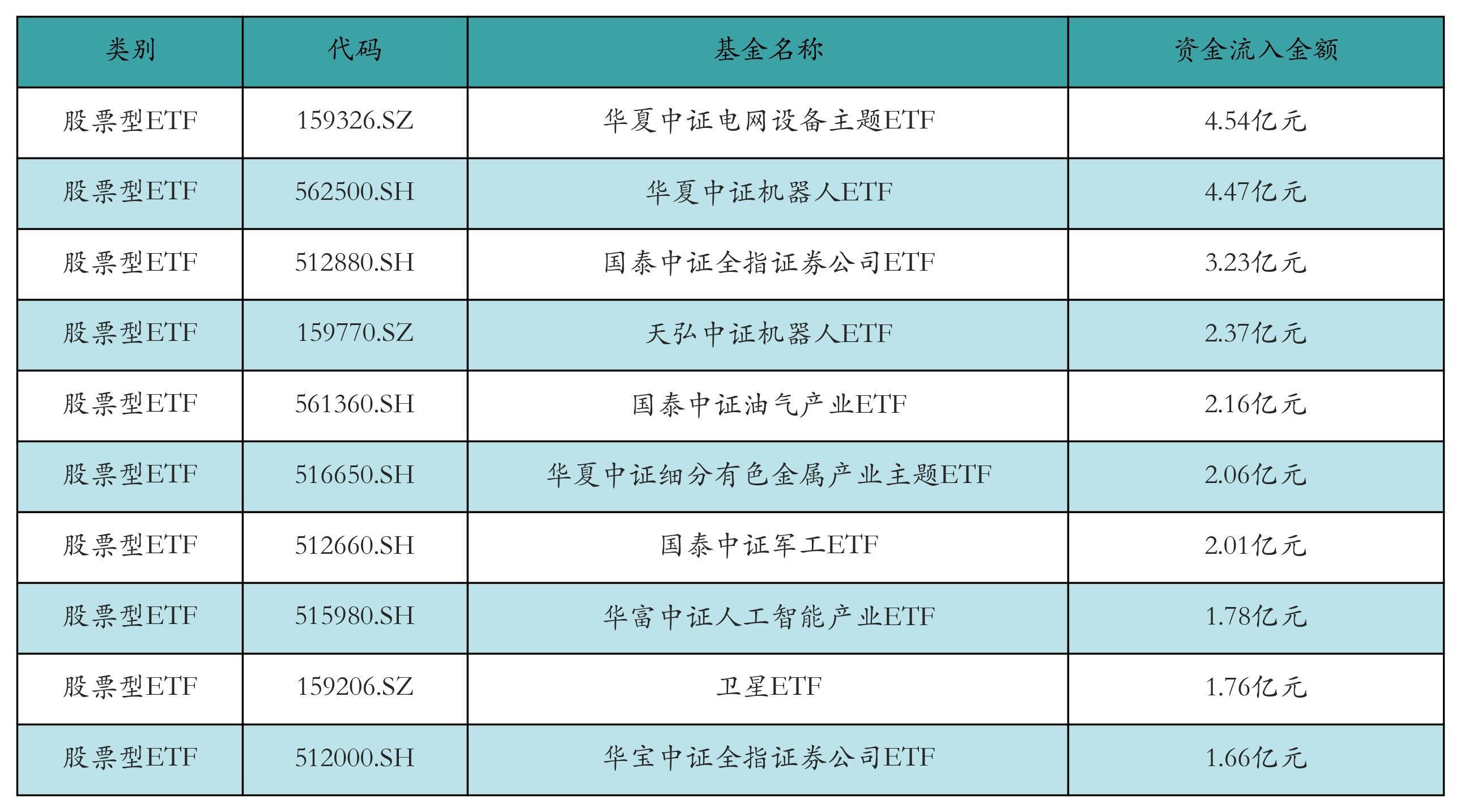 昨日股票型ETF资金流入最多的3只ETF及其流入金额分别为:华夏中证电网设备主题ETF(流入4.54亿元)、华夏中证机器人ETF(流入4.47亿元)、国泰中证全指证券公司ETF(流入3.23亿元)。资金流入前10详情见下表: