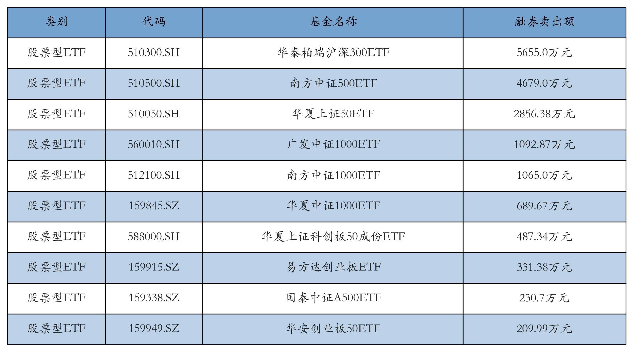昨日股票型ETF融资卖出额最高的3只ETF及其卖出金额分别为:华泰柏瑞沪深300ETF(5655.0万元)、南方中证500ETF(4679.0万元)、华夏上证50ETF(2856.38万元)。融券卖出额前10详情见下表: