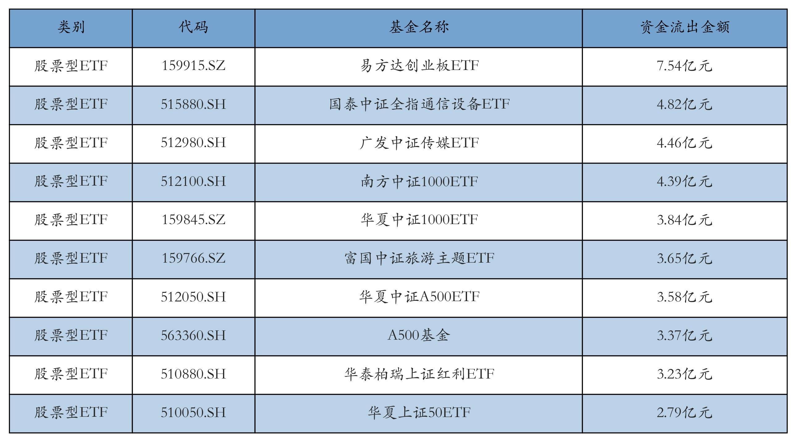 昨日股票型ETF资金流出最多的3只ETF及其流出金额分别为:易方达创业板ETF(流出7.54亿元)、国泰中证全指通信设备ETF(流出4.82亿元)、广发中证传媒ETF(流出4.46亿元)。资金流出前10详情见下表: