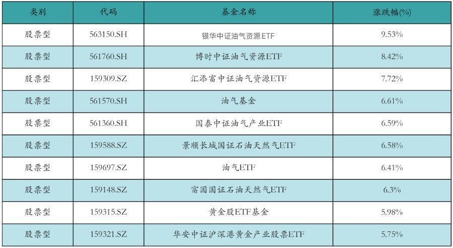 二、ETF市场表现1、股票型ETF整体市场表现昨日股票型ETF收益率中位数为0.77%。其中按照不同分类,规模指数ETF中万家中证800自由现金流ETF收益率最高,为2.79%;行业指数ETF中油气基金收益率最高,为6.61%;策略指数ETF中融通中证诚通央企红利ETF收益率最高,为4.06%;风格指数ETF中大成深证成长40ETF收益率最高,为2.95%;主题指数ETF中油气资源收益率最高,为9.53%。