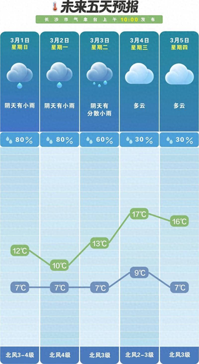 据市气象台预计,3月1日(周日)阴天有小雨,北风3到4级,气温7℃至12℃,出门踏青的计划怕是得缓一缓,撑伞漫步,倒也有几分“细雨湿衣看不见”的意境;2日(下周一)阴天有小雨,北风4级,气温继续走低,7℃至10℃,雨丝斜织,早出晚归记得添衣;3日阴天有分散小雨,北风3级,气温7℃至13℃,这场缠绵的雨终于将在元宵节白天收尾,当晚天气将转为多云,对户外出行赏灯比较有利;4日、5日,长沙多云,气温在7℃至17℃之间徘徊,阳光开始试探着“露脸”,随着气温逐渐回升,市民朋友届时才能真正体验到春天的暖意。