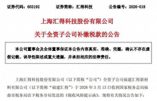 3月17日,汇得科技(603192)公告,公司全资子公司福建汇得新材料有限公司(简称“福建汇得”)于3月13日收到国家税务总局福鼎市税务局店下税务分局发送的《税收风险提示函》。