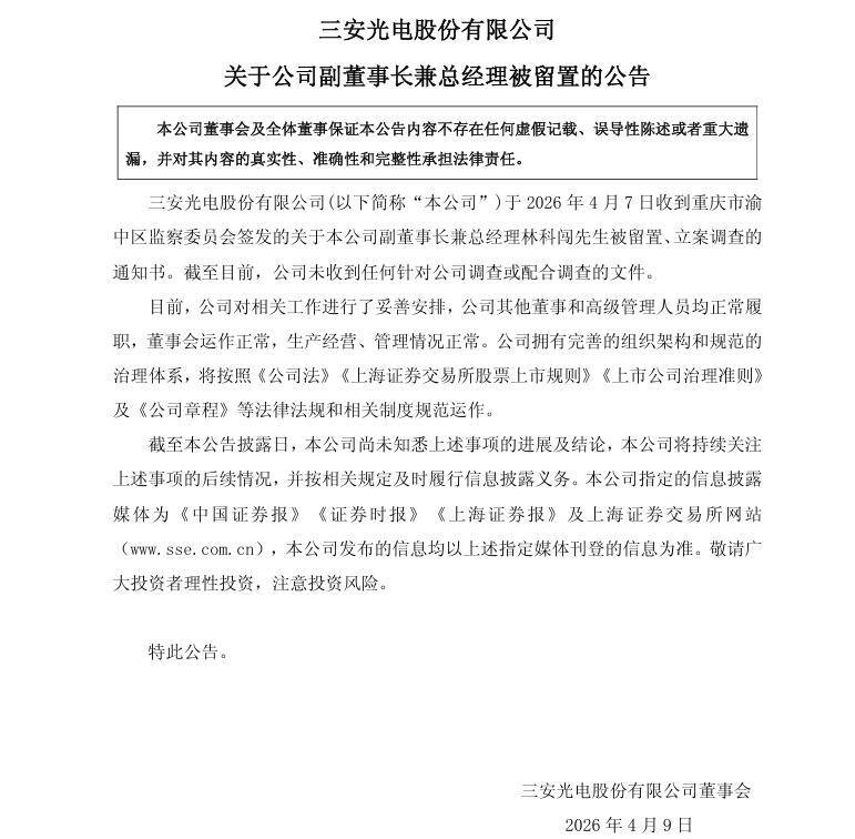 【大河财立方消息】4月8日晚间股票配资平台代理,三安光电股份有限公司公告称,4月7日该公司收到重庆市渝中区监察委员会签发的关于副董事长兼总经理林科闯被留置、立案调查的通知书。