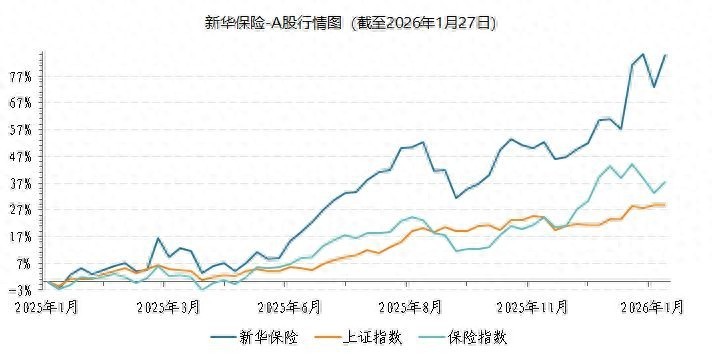 近两年来,乘着业绩向好与行业共振的东风,新华保险股价走出一轮强劲上涨行情。2025年,公司A股年内上涨46.03%,H股涨幅更是高达145.99%,领涨保险板块;2026年开年延续升势,公司股价多次刷新历史记录,1月13日A股收盘价达83.47元,总市值突破2316亿元,创历史新高,1月16日盘中更是触及85.8元历史新高,稳居高位。这根向上的K线,绝非偶然,而是新华保险以战略为纲、以经营为基、以服务为魂,共同绘就的高质量发展画卷。每一个股价高点的背后,都是步步为营的实干和久久为功的深耕。