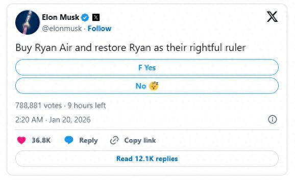 当地时间2026年1月19日,马斯克正式在X平台发起公开民意调查,询问订阅者他是否应该收购瑞安航空。该投票迅速吸引了超过60万次参与,且赞成票占比一度接近80%。瑞安航空官方账号则以调侃X平台系统稳定性作为回应,双方在社交媒体上的针锋相对令市场对这宗潜在的跨界收购案产生了高度关注。