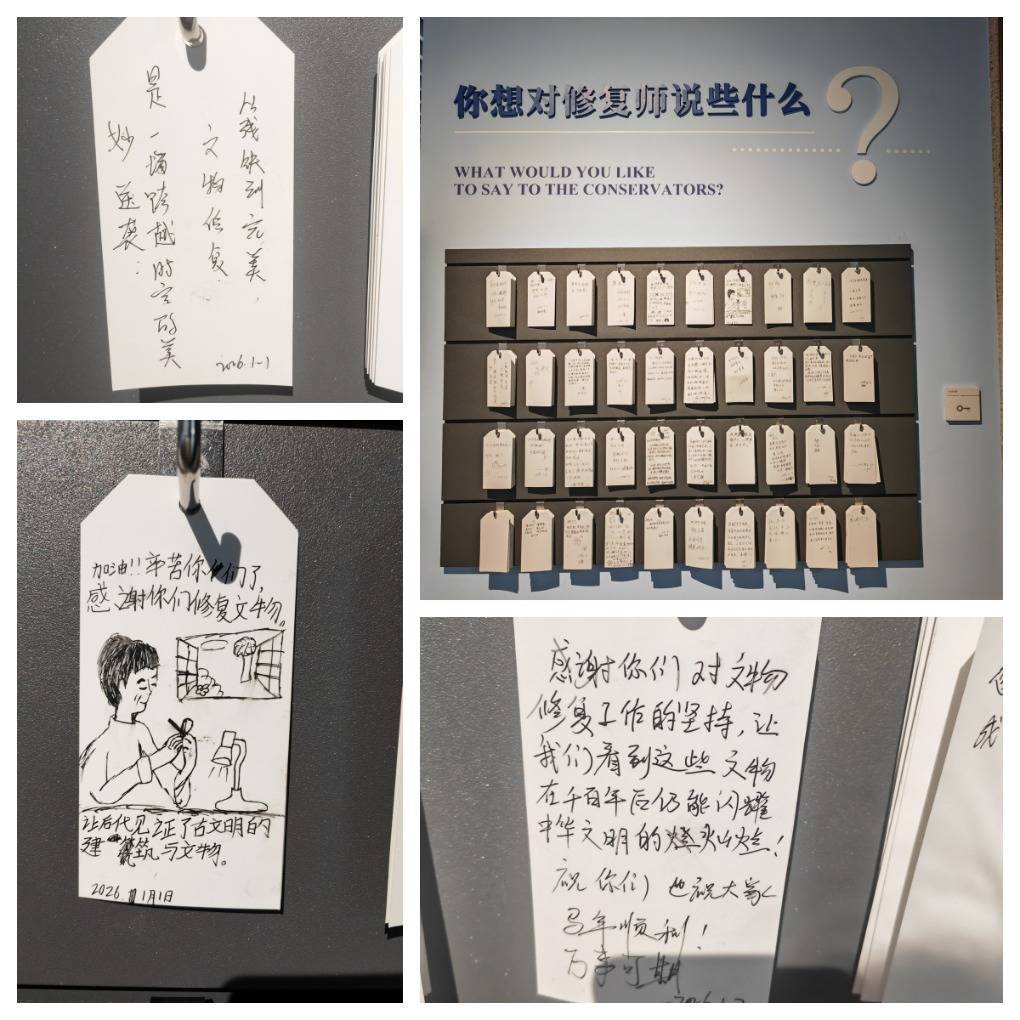 参展观众对文物修复师的寄语(拼版图片)。新华社记者 朱丽莉 摄