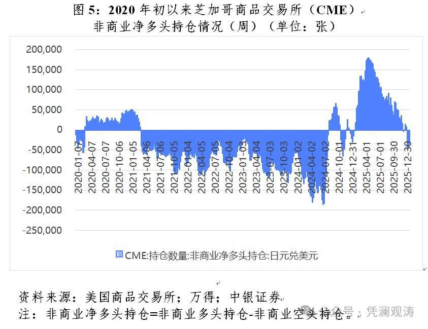 日美利差与日元汇率关系的“逆转”是日本经济深层次结构问题、财政刺激预期,以及市场提前消化加息预期等多因素共振的结果。如果日本央行加息幅度与节奏不到位,则难以扭转日元颓势。而日元持续贬值反过来又将推升加息压力:其一,贬值推高进口成本,加大日本输入性通胀压力,日本央行为稳通胀不得不加息;其二,尽管日美利差收窄,但利差绝对水平仍可覆盖套息交易成本,叠加日本政府债务负担加重削弱日元资产吸引力,资金持续外流,日本央行为稳汇率不得不加息。美国商品期货交易委员会数据显示,日元对美元非商业净多头持仓规模自2025年5月以来持续回落,到2026年1月底重新跌回净空头区间,反映了投机资金再次转向看空日元(见图5)。