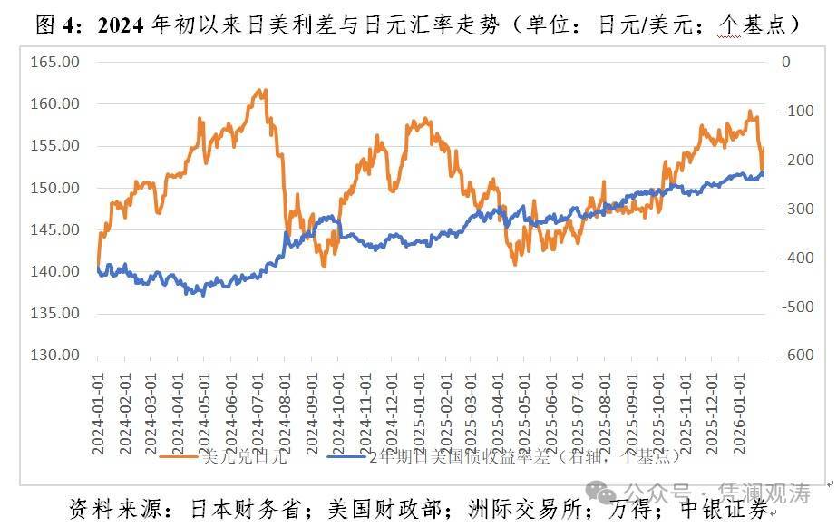 当日本深陷保汇市还是保债市的两难之际,2026年1月23日一则关于纽约联储询价日元汇率的报道引发了日美联合干预日元贬值的市场猜想,当天日元升值1.74%,创下5个月来单日最大涨幅。1996年以来,美国仅三次干预过汇市,上次是2011年日本地震后。2026年1月26日,日本财务省表示,日本当局将视需要与美国方面密切协调,对汇市波动做出适当回应。到1月30日,日元汇率收在154.77,较1月23日进一步升值了1.74%(见图4)。
