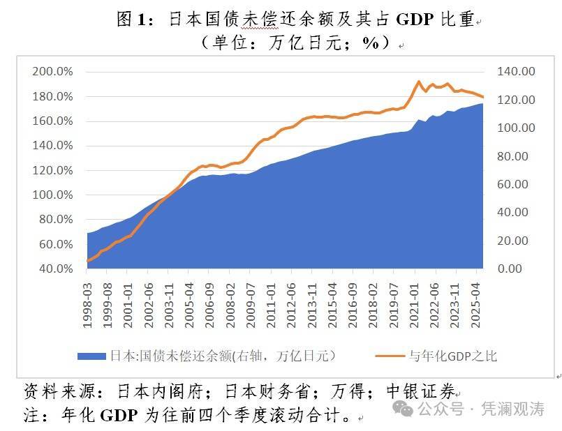 日本政府债台高企与日本经济“失去的三十年”密切相关。上世纪九十年代资产泡沫破裂,将日本推入资产负债表衰退。在非金融企业和家庭部门大幅去杠杆的背景下,日本政府不得不通过财政扩张来应对经济下行。在持续的财政刺激下,日本国债余额与年化国内生产总值(GDP)之比节节攀升,高至190.5%,到2025年9月末仍有179.5%(见图1)。国际货币基金组织(IMF)数据显示,2024年底日本政府债务与GDP之比为237%,系全球发达经济体中最高。