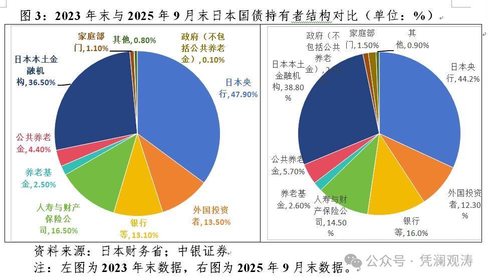根据日本财务省披露的数据,截至2025年9月末,外国投资者持有日本T-BILLS余额76.5万亿日元,约占日本T-BILLS存量规模的54.4%;持有日本JGB余额69万亿日元,约占日本JGB存量规模的6.6%。从全口径日债看,外资持债占比与日本央行退出YCC高度同步,从2024年3月末的13.0%一路降至2024年末的11.3%。2025年以来其持债规模虽有所回升,但集中在T-BILLS(新增1.2万亿日元),JGB持债规模较平稳(新增0.1万亿日元)。2023年末至2025年9月末,日本央行、外国投资者、人寿保险公司持有日债占比分别回落3.7、1.2和2.0个百分点,银行、养老基金及公共养老金、政府(不包括公共养老金)分别上升2.9、1.4和2.0个百分点(见图3)。需求不足导致市场缺乏流动性,小额抛售便足以引发大震动。根据日本债券交易公司数据,1月20日超长期国债交易金额仅有2.8亿美元。