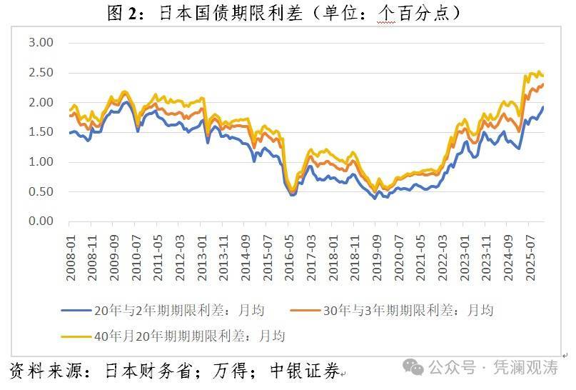 “高市冲击”的直接原因是本次公布的减税计划动摇了市场对日本财政可持续性及财政纪律的信心。与短端国债收益率着重反映货币政策松紧预期不同,长期国债收益率侧重对通胀预期和财政风险的定价。新冠疫情以来,日本大规模财政刺激的出台推动国债期限利差(以长期限国债收益率扣减2年期国债收益率计算)步入上行通道,2025年以来期限利差变得更加陡峭。到2026年1月,月均20年、30年和40年期与2年期日债收益率差分别较2024年12月上升了0.64、0.66和0.48个百分点(见图2)。此次高市早苗宣布的消费税减免被限定为两年,但市场预估每年仍将造成约5万亿日元税收损失。高市政府对于如何弥补相应财政收支缺口语焉不详,本次减税究竟是“暂时”还是“永久”,亦存在不确定性。
