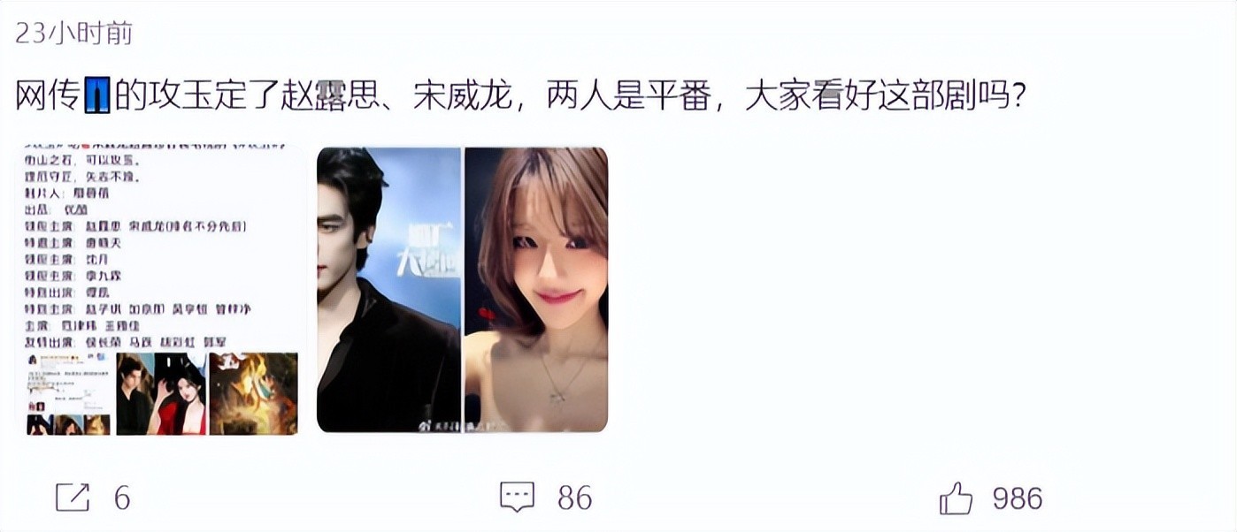 当传赵露思要接拍《攻玉》的消息后,大家都非常好奇,她将搭档哪位男演员,从传出的消息,她将搭档当红流量小生“宋威龙”。《骄阳似我》播出,让宋威龙直接出圈,不得不说,偶像剧还得高颜值演员出演。