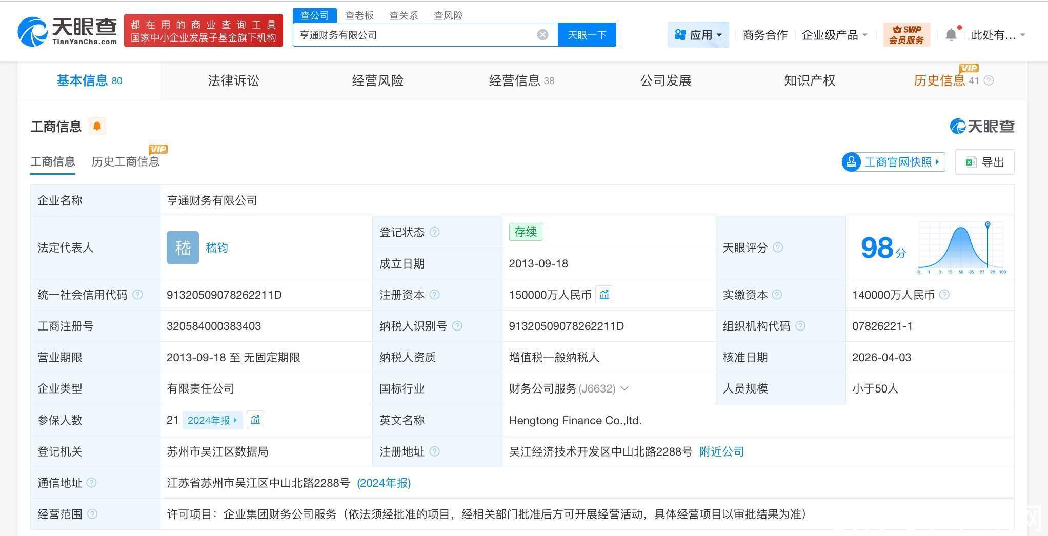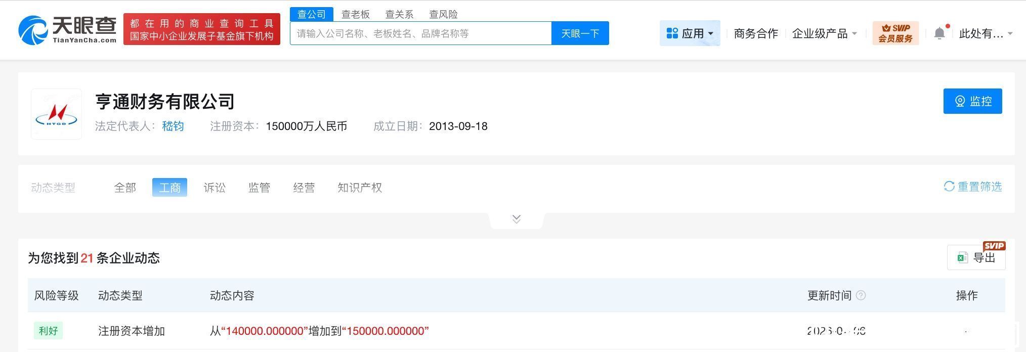 天眼查App显示,近日,亨通财务有限公司发生工商变更,注册资本由14亿人民币增至15亿人民币,增幅约7%.