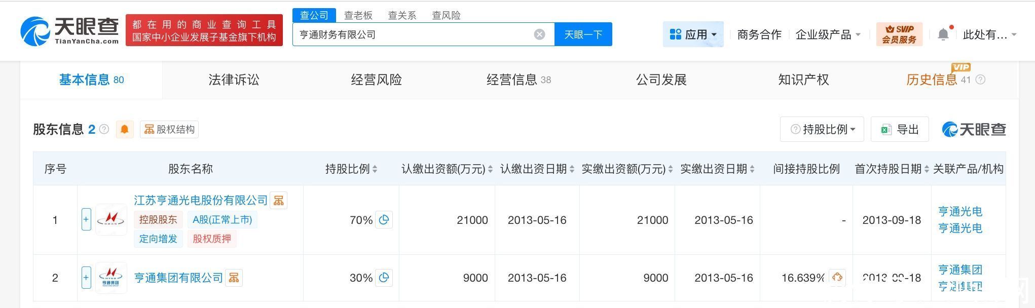 该公司成立于2013年9月,法定代表人为嵇钧,经营范围为企业集团财务公司服务。股东信息显示,该公司由亨通光电(600487)、亨通集团有限公司共同持股。