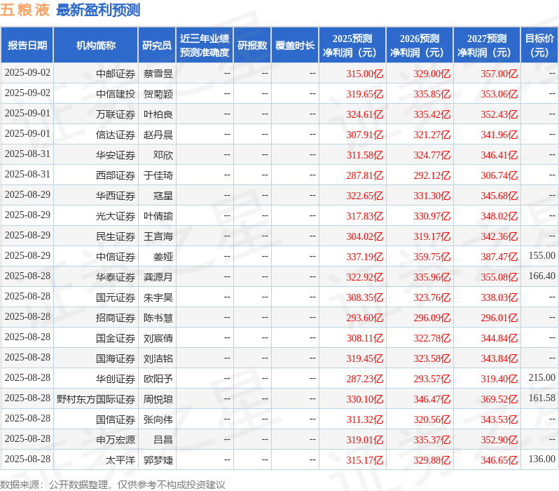 公司2025H1实现收入527.7亿元,同比+4.2%,归母净利润195.0亿元,同比+2.28%。Q2营业总收入158.3亿元,同比+0.1%,归母净利润46.3亿元,同比-7.6%。收入业绩符合预期。我们维持2025-2027年盈利预测,预计2025-2027年净利润分别为320.3、328.6、343.8亿元,同比分别+0.5%、+2.6%、+4.6%,EPS分别为8.25、8.47、8.86元,当前股价对应PE分别为15.6、15.2、14.5倍,公司年初对普五控量挺价,力争改善经销商利润,但5月份政策影响下效果一般,下半年公司普五继续控量,但会明显加大1618和低度五粮液的投入力度,积极抢占竞品份额,预计能对全年收入有明显拉动作用。此外,公司承诺2024-2026年度公司每年度现金分红总额占当年归母净利润的比例不低于70%,且分红总额不低于200亿元,股息率达4%,具有较高配置价值,维持“买入”评级。
